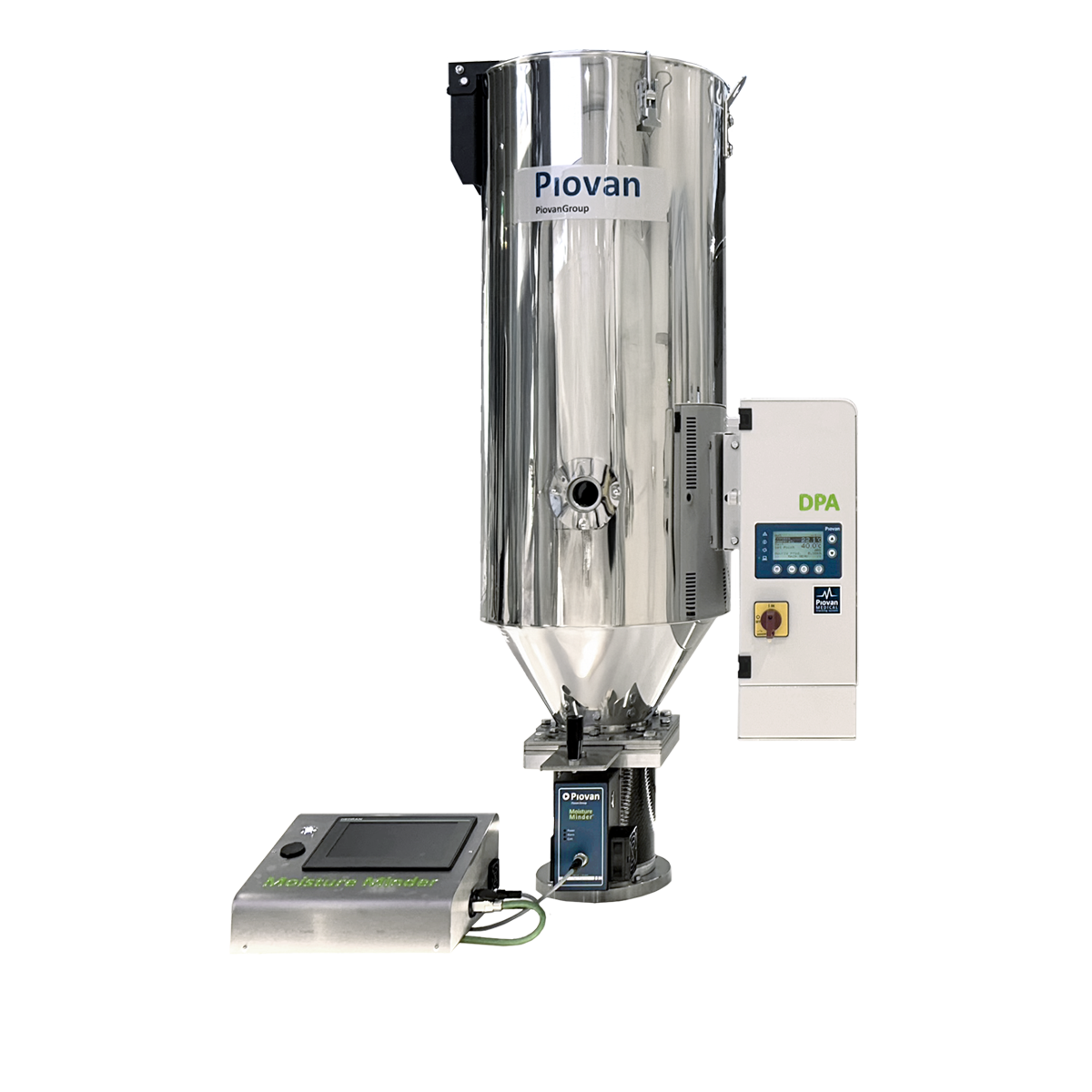 The PTUN drying hoppers can be combined in a multi-hopper drying system in order to guarantee maximum flexibility. Each hopper is equipped with an electrical heater on board. The control allows the setting of a different temperature for each hopper; in this way different materials can be dried at the same time, using the right process parameters for each of them. The process air flow passing through the hopper can be adjusted by the operator or in a fully automatic mode according to the actual production with Modula.